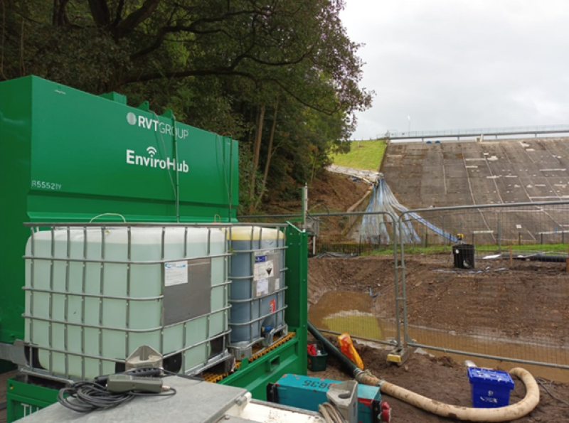 Given the importance of the Dam, and the sensitive nature of the surrounding site environment, RVT had to move quickly and get the right solution in place. RVT promptly attended site, took and analysed water samples and combined the sample information with the geological nature of the ground. As a result, RVT proposed a complete EnviroHub® chemical dosing water management system. This included EnviroHub® TU02 Dosing Skid, EnviroHub® TT10 Treatment Tank and EnviroHub® HL50 Lamella Plate Settlement Tank. The EnviroHub® system was able to achieve a particulate removal rate of around 95%. The system accomplished this by the neutralisation of colloidal (fine/clay) particles, allowing them to agglomerate together forming heavier flocs, which then easily settle out in our EnviroHub® Lamella Tanks.