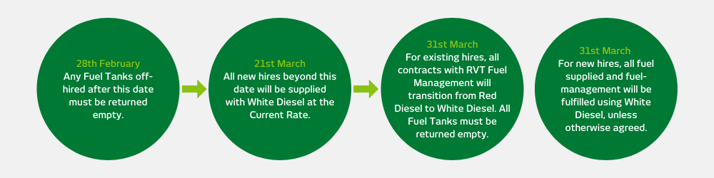 • From the 31st March 2022 onwards, current hires relying on us for fuel management will be transitioned across from Red Diesel to White Diesel and the fuel rate will change to the current rate at that time. Today’s rate for white diesel is £1.52 per Litre, but this is liable to fluctuation.