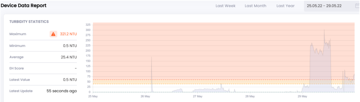 An example of the cloud-based platform user interfaceThis unit can also be used to double check water quality after site water has been cleansed, neutralised and discharged into a river under an Environmental Permit. This will not only give the site team peace of mind, but the data can also be used as evidence of compliance should any environmental questions arise.
