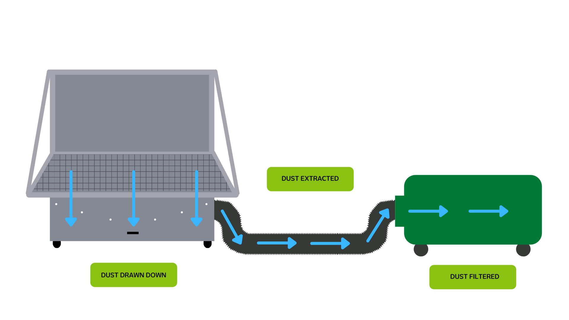 When working at the bench, dust or fume is drawn down through the work surface, extracted through the ducting, and then contained within the filter unit.